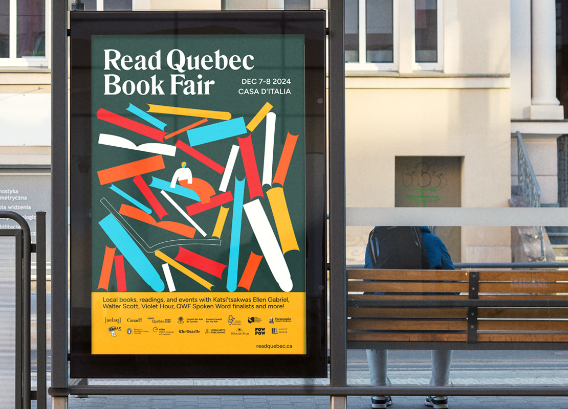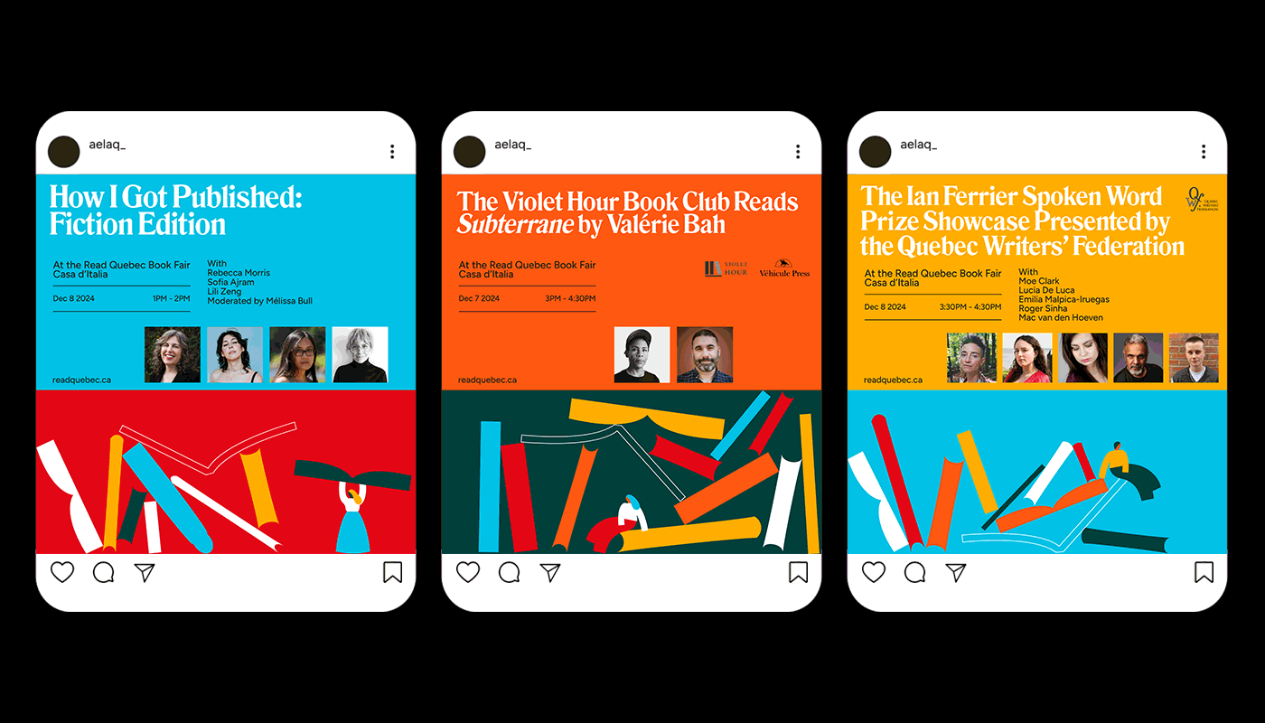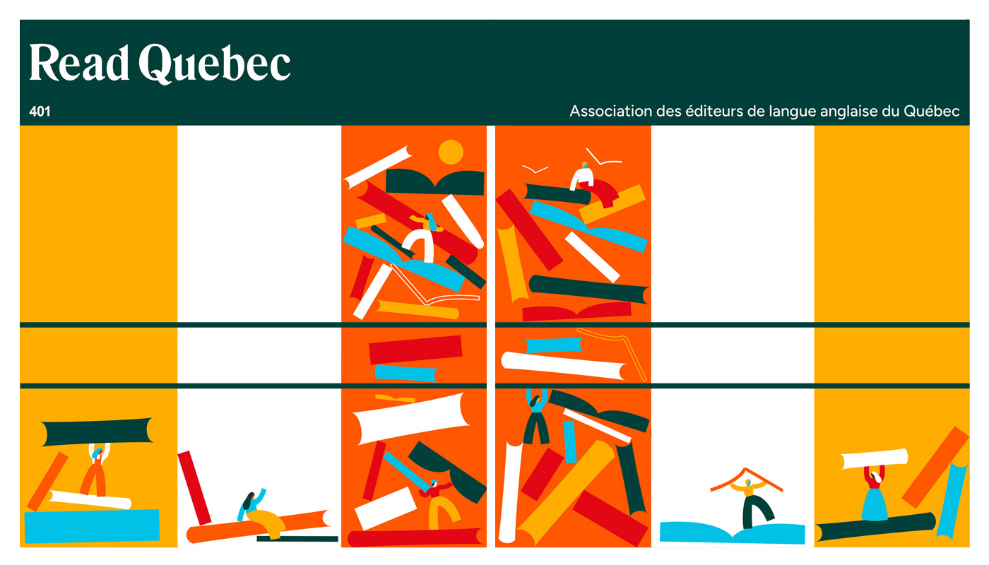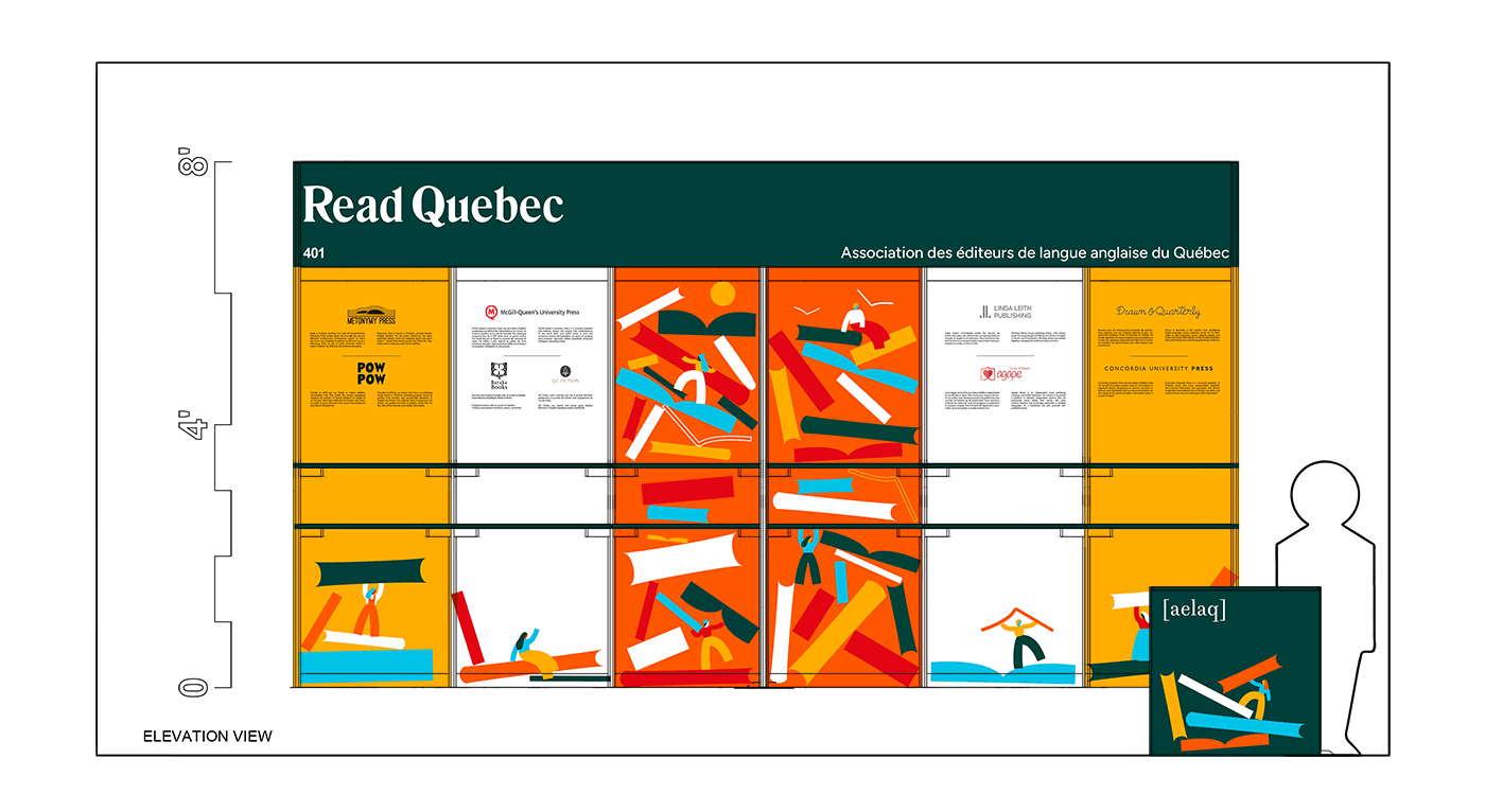 I had the pleasure of creating the visuals for AELAQ's (Association of English-language Publishers of Quebec) presence at the Salon du Livre de Montréal and for their own event, the Read Quebec Book Fair. Visual assets needed for both events were a branded kiosk, web banners for workshops and panels, ads, signage, posters, flyers and a sticker.