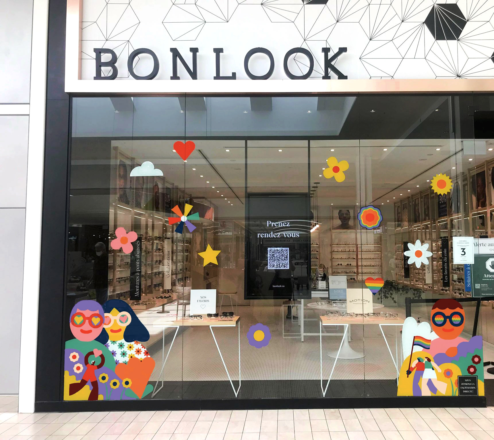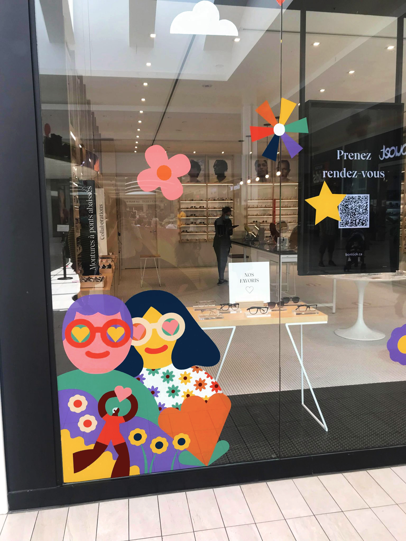 I was asked by Canadian eyewear brand BONLOOK to create illustrations for their Pride window displays. I was inspired by the aesthetics of the 70s to create inviting and warm images.