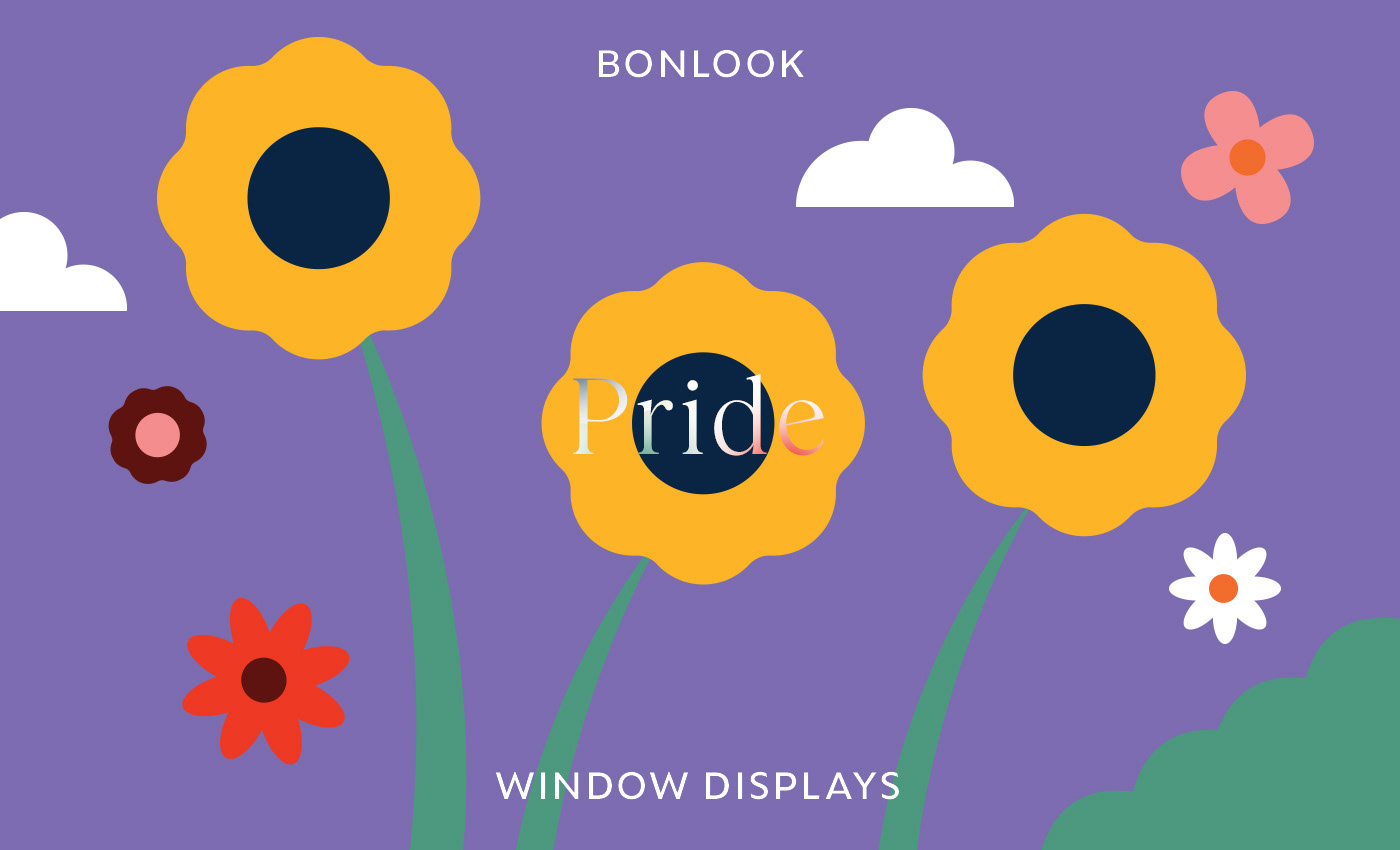 J'ai été mandatée par BONLOOK afin de créer des illustrations pour leurs vitrines de la Fierté. J'ai été inspirée par l'esthétique des années 70 afin de créer des images invitantes et chaleureuses.