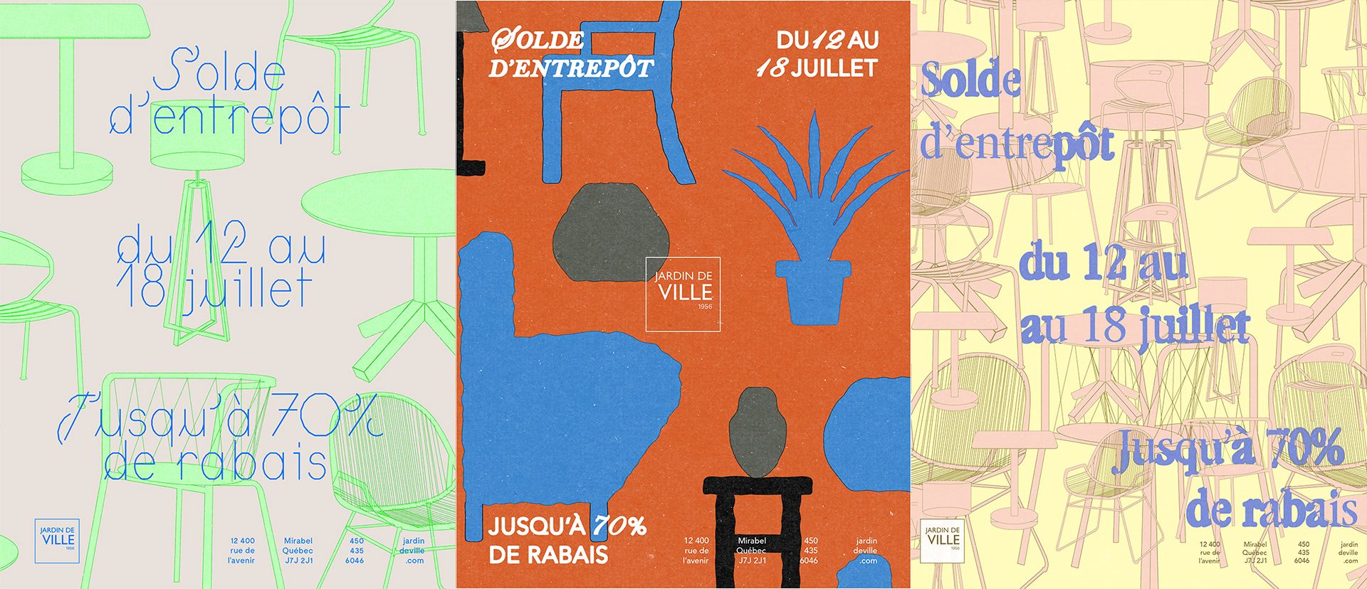 Propositions d'affiche pour promouvoir la vente d'entrepôt d'été de Jardin de Ville.