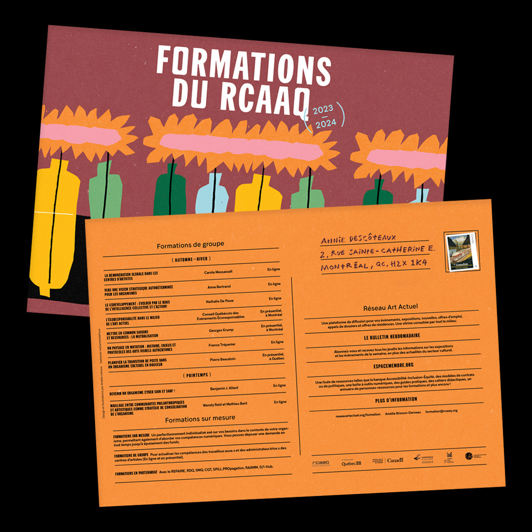 Le Regroupement des centres d’artistes autogérés du Québec (RCAAQ) est un organisme national dont la mission est de servir, rassembler, représenter et promouvoir les centres d’artistes autogérés du Québec. Afin de stimuler le déploiement de l’art dans la société, il soutient la recherche et l’expérimentation dans les domaines de l’art actuel et encourage la gestion d’organismes par les artistes. J'ai été mandatée de réaliser les illustrations/vignettes, 16 au total, ainsi qu'un encart imprimé pour la promotion de leurs formations 2023-2024.