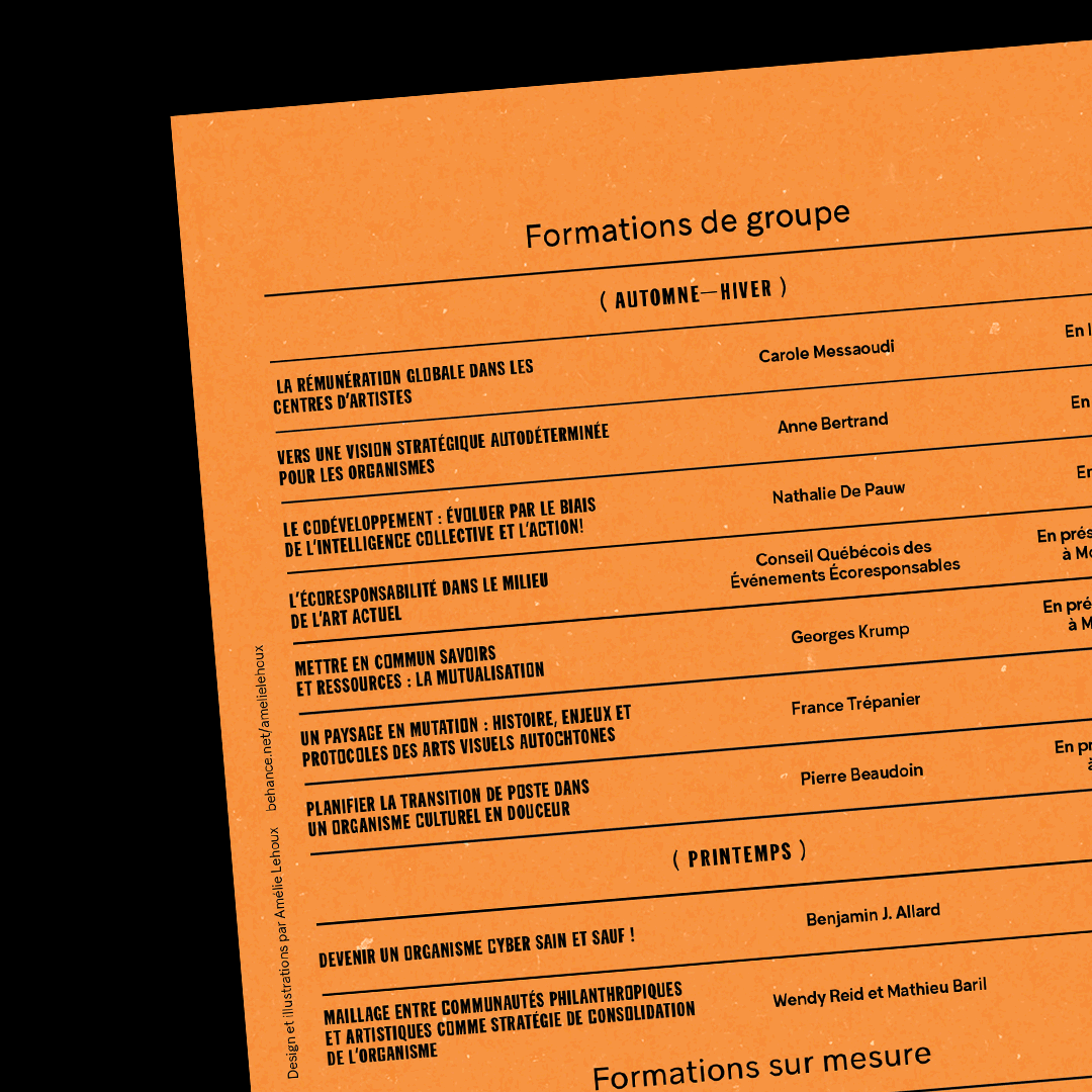 The Regroupement des centres d’artistes autogérés du Québec (RCAAQ) is a national advocacy organization whose mandate is to support, bring together, represent, and promote Quebec’s artist-run centres. To facilitate the dissemination of art within society, it supports research activities and artistic experimentation, and encourages self-management by artists. I was commissioned to create illustrations/vignettes, 16 in total, as well as a printed poster to promote their 2023-2024 training courses.